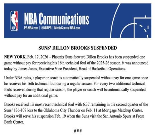 北京時間2月13日,據(jù)聯(lián)盟官方消息,太陽前鋒狄龍-布魯克斯因領(lǐng)到個人本賽季第16次技術(shù)犯規(guī),被處以禁賽一場、無薪...
