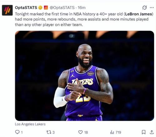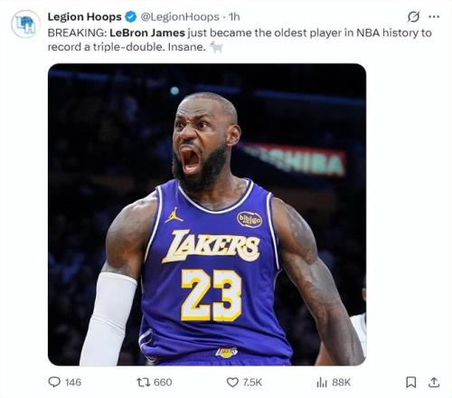 美媒LH寫道勒布朗成為歷史最年長(zhǎng)的三雙球員,GOAT。