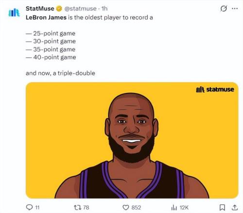 數(shù)據(jù)媒體Statmuse寫道:詹姆斯從最年長(zhǎng)單場(chǎng)25+、單場(chǎng)30+、單場(chǎng)35+、單場(chǎng)40+到單場(chǎng)三雙。勒布朗-詹姆斯自最年輕的紀(jì)錄到最年長(zhǎng)紀(jì)錄都統(tǒng)治了一個(gè)遍。