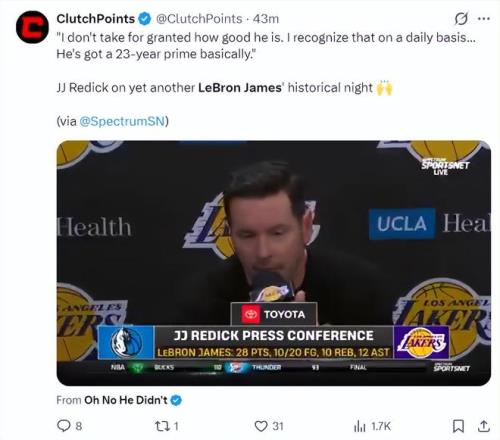 雷迪克賽后談到詹姆斯:我從來(lái)沒(méi)有把勒布朗的表現(xiàn)當(dāng)成理所當(dāng)然,但我每天都有切實(shí)的感受,他仍處于職業(yè)生涯的巔峰期,他已經(jīng)在巔峰23年之久了。