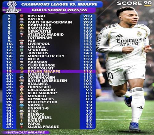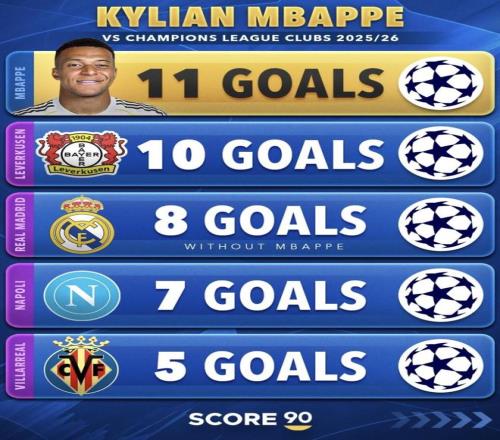 榜單一:姆巴佩對(duì)比歐冠球隊(duì)進(jìn)球(2025/26)