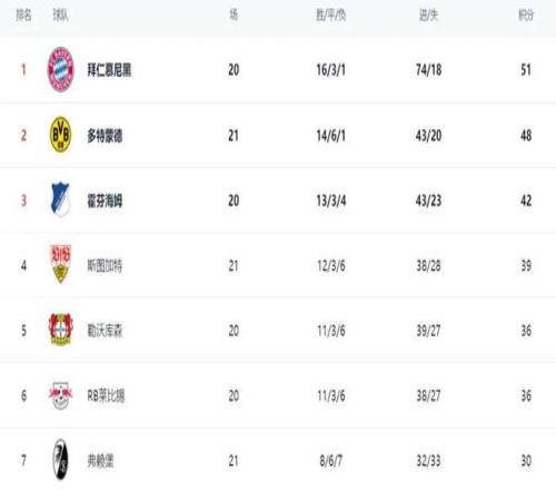 拜仁德甲弗賴堡隊霍芬海姆積分戰(zhàn)報勒沃庫森隊多特蒙德隊云達不萊梅隊
