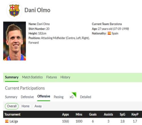 本賽季至今,奧爾莫西甲10次先發(fā)6次替補,踢了1000分鐘,貢獻了6球3助攻,差不多每110分鐘就能參與一個進球,這個效率還是很高的。