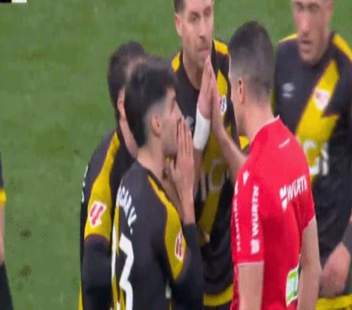 此役補時多達9分鐘,在補時第8分鐘,門迪禁區(qū)內解圍之后踢到迪亞斯,主裁判判罰點球。這次判罰讓巴列卡諾球員非常不滿,長時間圍住主裁判爭辯,直到比賽結束之后,門迪還不斷搖頭。