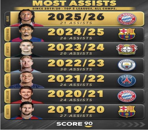 五大聯(lián)賽助攻榜:拜仁賺了!奧利塞領(lǐng)跑效率甩巔峰期梅西太多