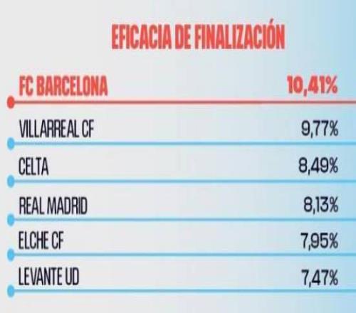 巴薩是本季西甲射門轉(zhuǎn)化率最高球隊(duì),阻止對(duì)手射門比例也最高