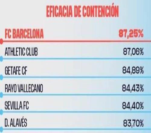 巴薩在防守中成功阻止對(duì)手完成射門的比例為87.25%,領(lǐng)先于畢爾巴鄂競(jìng)技(87.06%)和赫塔費(fèi)(84.89%),成為阻止對(duì)手進(jìn)攻的最佳球隊(duì)。