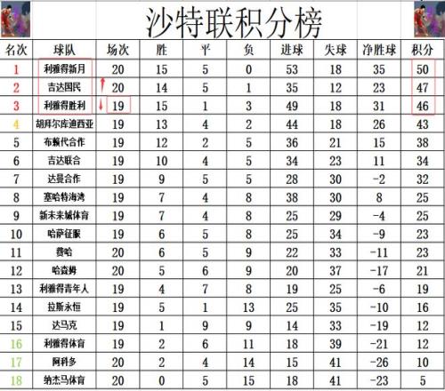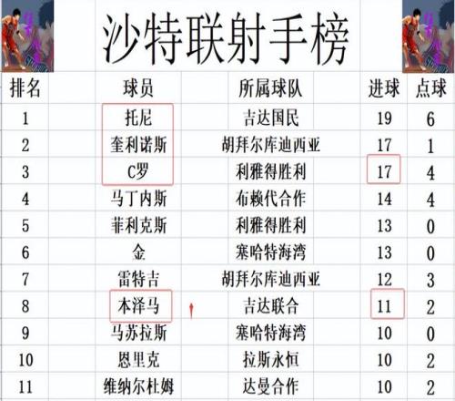 積分榜方面,難怪C羅要郁悶,本澤馬一來(lái)就造4球,利雅得新月狂勝,他們暫時(shí)又將和利雅得勝利的差距拉大到4分。吉達(dá)國(guó)民先賽贏球后,1分優(yōu)勢(shì)將利雅得勝利擠到第3的位置。