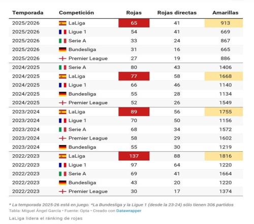 馬卡:西甲65張紅牌領(lǐng)跑歐洲五大聯(lián)賽,本賽季或破百張