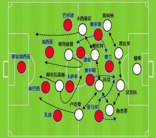 馬競(jìng)做得最好的一點(diǎn),就是通過后場(chǎng)直接長(zhǎng)傳找邊路,打出兩翼齊飛后增加肋部的前插,弗里克會(huì)要求巴薩球員快速擠壓向一側(cè),但馬競(jìng)又會(huì)轉(zhuǎn)移球打另外一側(cè),兩邊都能起速,最終就把巴薩的防線撕碎了。