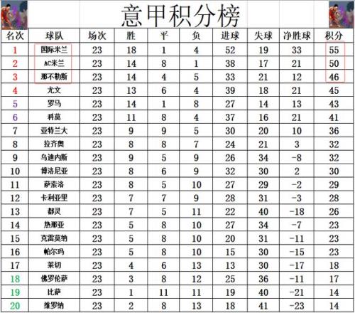 積分榜方面,本輪前三全部贏球,AC米蘭就還是差國米5分位列第2,那不勒斯落后國米9分排在第3,第4的尤文則是落后國米10分。博洛尼亞慘敗后無力回前8,排在第10。