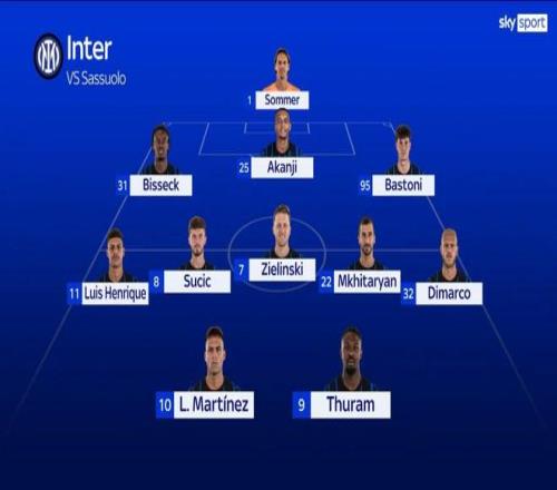 國米周中在意杯中大輪換贏下都靈,絕大部分主力都得到了良好輪休,只有小圖拉姆出場時間超過了45分鐘,而且下一場國家德比又是6天之后,所以本場比賽并不存在體能問題和輪換需要,球隊可以全主力出戰(zhàn)!因為恰爾汗奧盧、巴雷拉和鄧弗里斯三名主力還未復出,所以國米只能排出目前理論上的最強陣容,相信大家對此都不會有質疑,接下來就看薩索洛能否經(jīng)得起這套陣容的檢驗了!