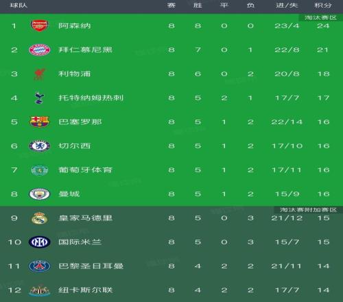 第七輪結(jié)束時(shí),已經(jīng)確定提前出線的阿森納和拜仁排名前二,皇馬和利物浦同積15分排名第三、第四,托特納姆熱刺14分第五,而巴黎、紐卡和切爾西同積13分排名六至八名。