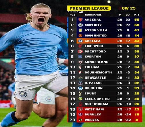 北京時(shí)間2月9日凌晨,隨著本輪焦點(diǎn)戰(zhàn)利物浦主場遭曼城絕殺,英超第25輪十場比賽全部戰(zhàn)罷。阿森納3比0完勝桑德蘭,繼續(xù)6分領(lǐng)跑英超;曼城憑借哈蘭德93分鐘的制勝點(diǎn)球2比1力克利物浦,坐穩(wěn)次席,領(lǐng)先本輪打出平局的維拉3分;曼聯(lián)2比0擊敗熱刺,繼續(xù)排名第四,距離維拉3分;切爾西3比1擊敗狼隊(duì),領(lǐng)先本輪輸球的利物浦4分,兩隊(duì)分列第五、第六。
