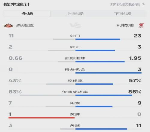 全場(chǎng)數(shù)據(jù)慘淡:控球率57%、射門23-11遙遙領(lǐng)先,但射正僅3次!預(yù)期進(jìn)球(xG)1.95卻只打入1球,甚至這唯一的進(jìn)球還是范戴克頭球反彈入網(wǎng),帶有極大的運(yùn)氣成分。
