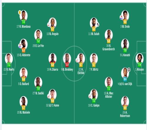 利物浦替補:25-馬馬爾達什維利、6-凱爾凱茲、42-尼奧尼、47-卡爾文·拉姆塞、68-莫里森、73-恩古莫哈。