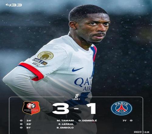 法甲第22輪,巴黎圣日耳曼客場1-3不敵雷恩,終結(jié)聯(lián)賽7連勝。杜埃錯失單刀良機,塔馬里首開紀(jì)錄,勒波爾擴大領(lǐng)先優(yōu)勢,登貝萊扳回一城,恩博洛鎖定勝局。