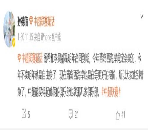 孫德信在社媒上表示:楊希和李昊都是明年合同到期,今年青島西海岸肯定會賣的!今年不賣明年就是自由身了,現(xiàn)在青島西海岸也是在等更好的報價,所以大家也別著急了,中超能買得起他倆的俱樂部也就那幾家俱樂部。