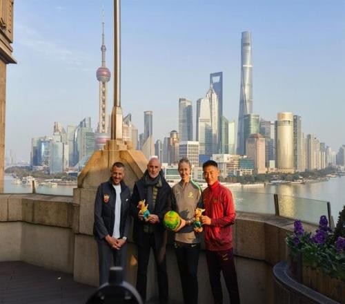 穆斯卡特及海港助理教練和澳大利亞女足前國腳格蕾絲、中國男足助理教練于漢超等合影。