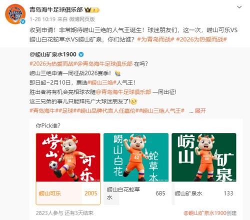 值得一提的是,青島海牛的胸前廣告已經(jīng)呼之欲出,并確定為“嶗山三絕”(嶗山可樂(lè)、嶗山白花蛇草水、嶗山礦泉)中的一款,目前這三款產(chǎn)品正在火熱打榜中,相信很快會(huì)有結(jié)果。