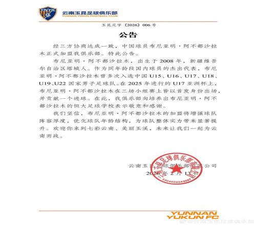 經(jīng)三方協(xié)商達(dá)成一致,中國球員布尼亞明-阿不都沙拉木正式加盟我俱樂部。特此公告。